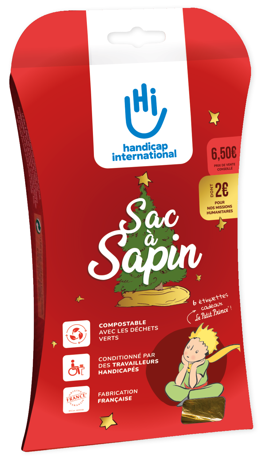 Cela fait plus de 30 ans que l e Sac à Sapin de Handicap International accompagne les fêtes de fin d’année en décorant votre arbre de Noël tout en protégeant le sol des aiguilles. En 2025, le Petit Prince illustre une nouvelle fois son packaging ainsi que les étiquettes cadeaux offertes à l’intérieur.