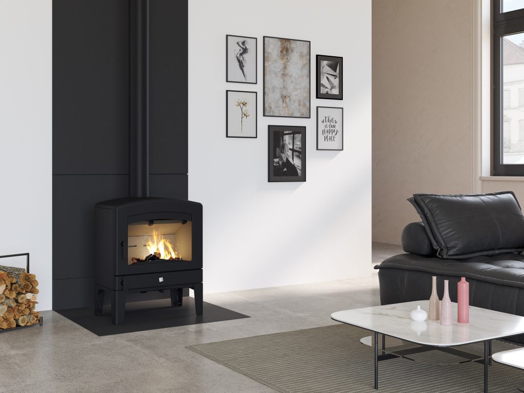 AGATE séduit par ses lignes sobres et son encombrement contenu (83 x 67 x 53 cm pour un poids de 230 kg). Il s’intègre facilement dans les intérieurs où élégance et discrétion sont recherchées. Derrière cette simplicité se cachent des performances certifiées selon la norme EN16510. Grâce à sa façade vitrée claire et son noir satiné, AGATE offre une vision du feu nette et met l’accent sur la sobriété décorative. Il s’adresse aux pièces de vie de taille moyenne, où la recherche d’équilibre entre efficacité énergétique et esthétique est primordiale.