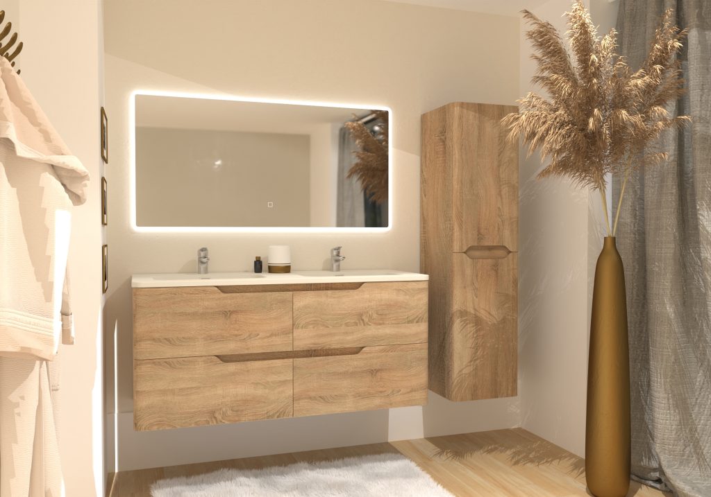 Au cœur de l’aménagement, le meuble de salle de bains est devenu un élément incontournable. Sanitaire.fr mise sur des lignes contemporaines, des finitions soignées et des solutions de rangement optimisées. Les meubles suspendus, très appréciés, apportent légèreté visuelle et facilité d’entretien, tandis que les plans vasque généreux, simples ou doubles, répondent aux besoins du quotidien. Les miroirs lumineux et fonctionnels complètent l’ensemble, en associant confort d’usage avec anti buée et esthétique moderne.