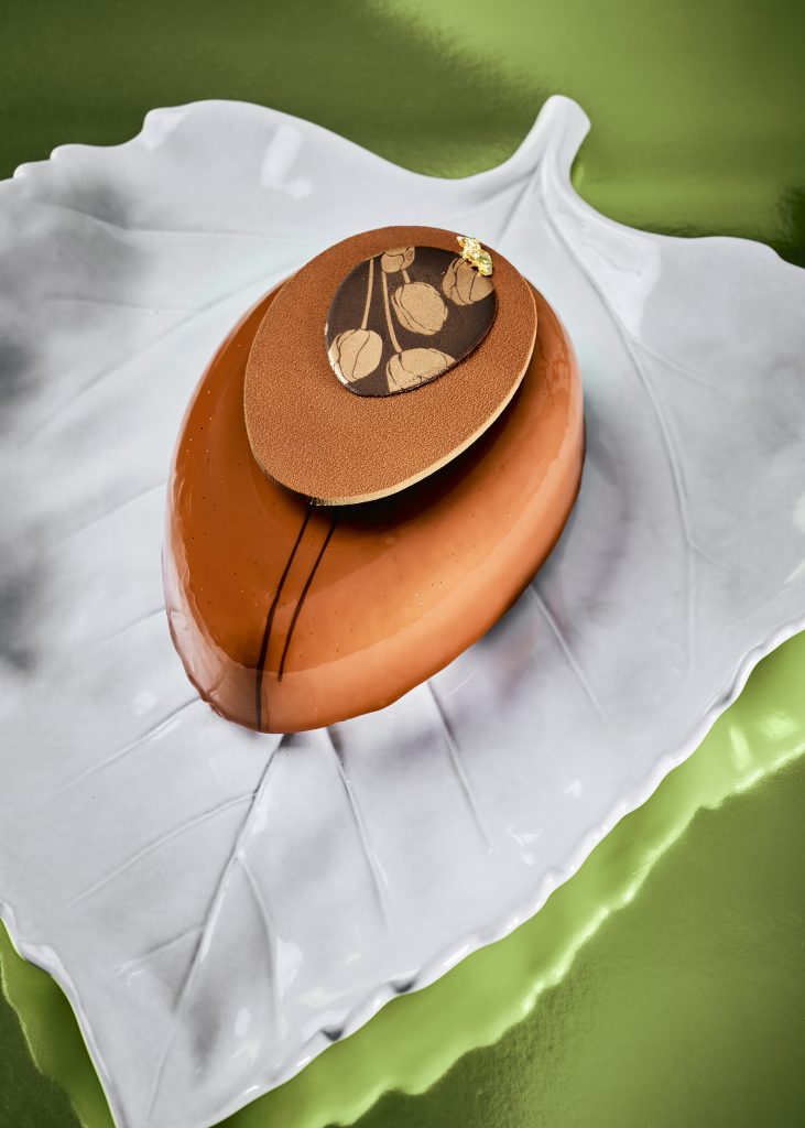 L’Entremets Œuf Floral : Cette création gourmande repose sur un sablé gianduja, surmonté d’un biscuit noisette. Il associe un crémeux gianduja noisette et un praliné de noisettes françaises à l’ancienne, avant d’être recouvert d’une ganache montée au chocolat au lait.